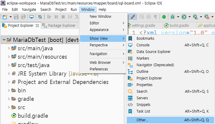 Windows > Show View > Other…를 선택한다.