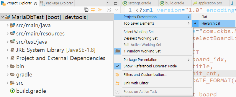 Project Explorer에 ∨ 버튼을 누른 후 Package Presentation > Hierarchical을 선택한다.
