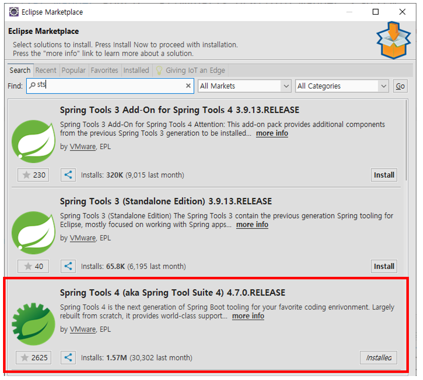 이클립스 상단 메뉴중 Help > Eclipse Marketplace…을 선택한다. Find 창에서 STS를 검색한다.