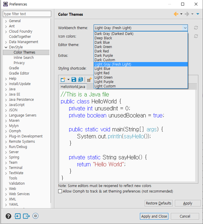 추후 테마를 변경하고 싶다면 Windows > Preferences를 선택한 후 DevStyle에서 Color Themes에서 변경 가능하다.