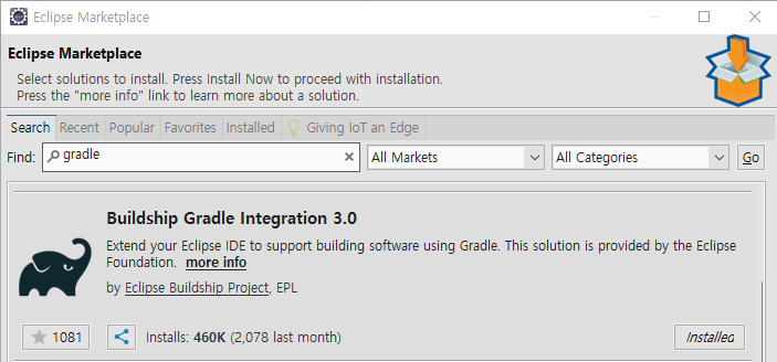위에서 STS를 설치한 것처럼 마켓플레이스에서 gradle을 검색해 설치한다. 이미 설치가 되있다면 넘어가도 좋다.