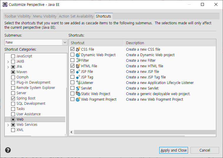 Windows > Preferences > Customize Perspective를 선택한다.